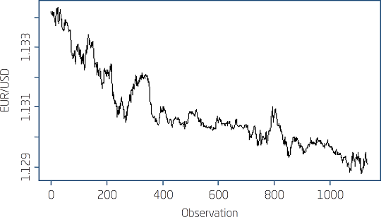 Figure 3.1.1 shows the evolution of the minute-to-minute exchange rate close for the first sample. The time interval extends from 08/23/2016 08:02 am (UTC) through 08/24/2016 03:02 am (UTC). Figures 3.1.2 and 3.1.3 present, respectively, samples 2 and 3 used for estimation of models in uptrend (from 03:21 pm UTC on 08/17/2016 to 04:05 pm UTC on 08/18/2016) and in range (from 09:41 am UTC on 08/16/2016 to 01:54 pm UTC on 08/17/2016).