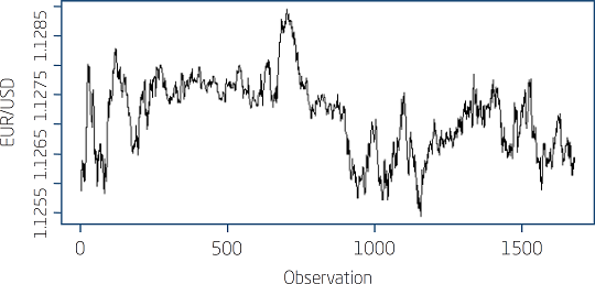 Thus, this study has the general objective of evaluating which EUR/USD pair exchange rate modeling method results in better forecasts when using high-frequency data. To achieve this goal, we adopted the following steps: 1. modeling the one-minute series of the EUR/USD pair exchange rates with the SSA (non-parametric) and the ARIMA-GARCH (parametric) estimation methods; 2. forecasting using the two models4; and 3. evaluating which model is the most appropriate, by means of the root mean square error (RMSE), the mean absolute percentage error (MAPE) and Theil’s inequality coefficient (TIC).