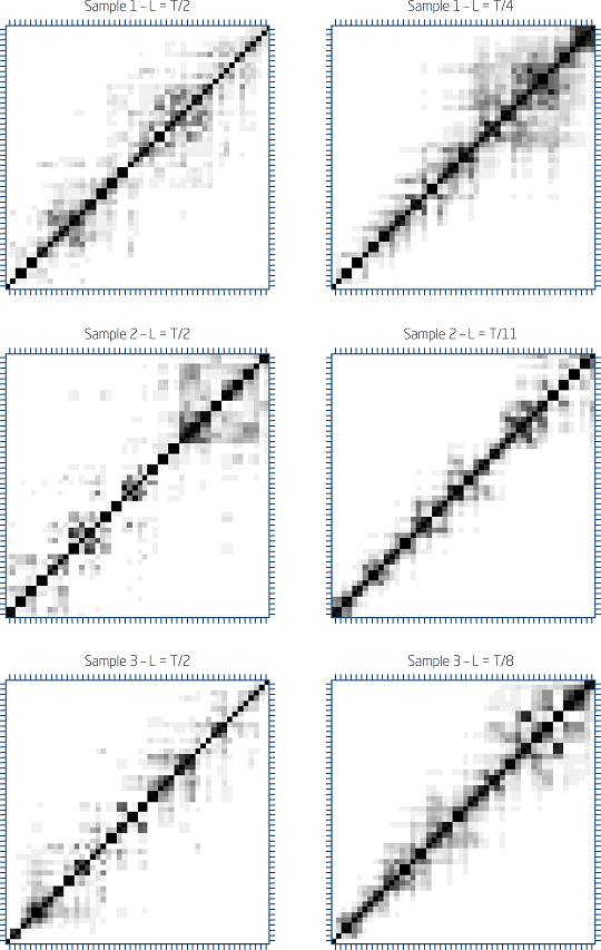 As a means of obtaining the best window, several decompositions were conducted through trial and error, starting from the maximum value suggested by Hassani (2007), . The “separability” of each decomposition was verified using the weighted correlation matrix of the vectors from the trajectory matrix. Figure 4.1.1 displays some weighted correlation matrices resulting from the different decomposition windows and Figure 4.1.2 shows the optimum parameters found for each sample set. These parameters were found by the trial and error method.
