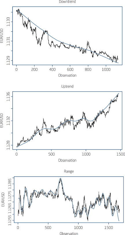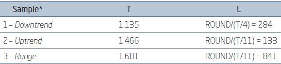 The data were selected so that the three typical movements of the financial markets could be obtained: the uptrend or bull trend; the downtrend or bear trend; and the absence of a trend (range). The analysis of the predictions for both models was made for each sample.