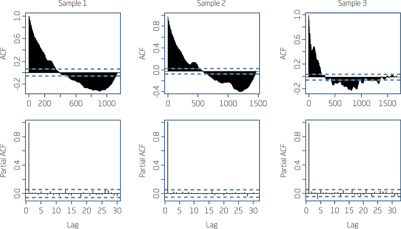 To perform the modeling, only the last five data of each of the samples were not used. That is, the definition of the best models was made according to the criteria of each technique separately and using 1135 data from the downtrend series, 1466 from the uptrend, and 1681 from the sample with no trend. In the end, out-of-sample predictions were performed for five minutes ahead using the two models, fitted for each of the three samples and compared to each other.