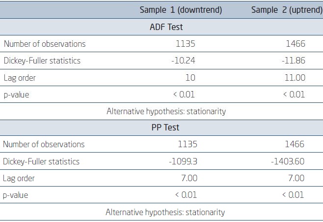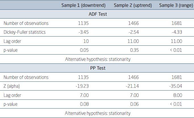 Augmented Dickey-Fuller (ADF) and Phillips-Perron (PP) tests were deployed for checking if the series were stationary. Figure 4.2.1 presents the test results for each series.