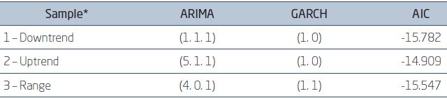 Design/methodology/approach: Time series models were estimated using the ARIMA-GARCH and SSA techniques, taking into account three samples of the ask exchange rate (closing): uptrend, downtrend, and no well-defined trend.
