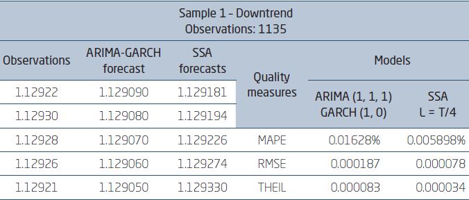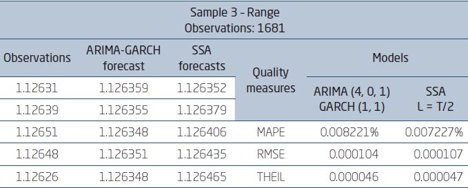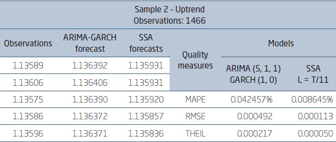 According to the results shown in the figures, the forecasts made by the SSA were the ones closest to the original observations for the three cases in which the technique was applied and also for all quality measures, except in sample 3, in which RMSE and TIC were better for ARIMA-GARCH. This fact allows concluding that the SSA forecasts, with respect to the exchange rates in this period, are more adequate than those obtained by the ARIMA- -GARCH model independently of the market movement, that is, for both uptrend and downtrend when there was no well-defined trend.