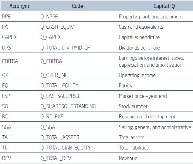 Figure 3.1.1 shows the search variables extracted from the Capital IQ database, as well as their respective acronyms, description, and code in the database.