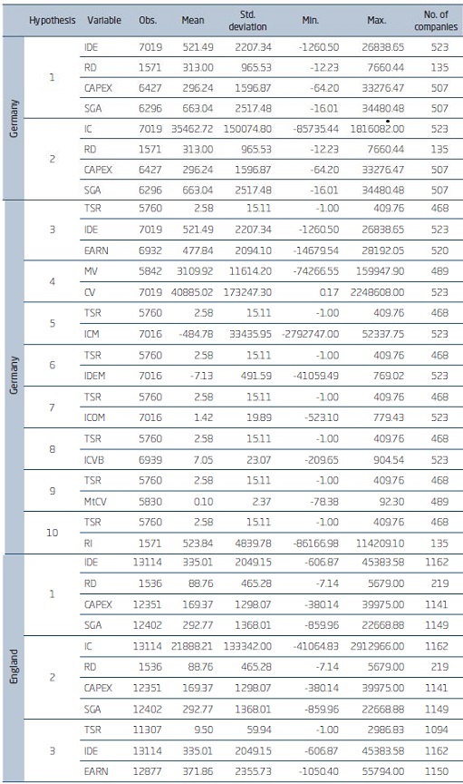 After the loss of the degree of freedom, due to the delay of 1 period, as well as the disregard of part of the missing database, the final sample of the survey is composed of 519 companies from Germany, 1,151 companies from England and 28 from Portugal.