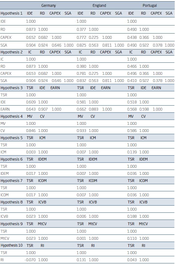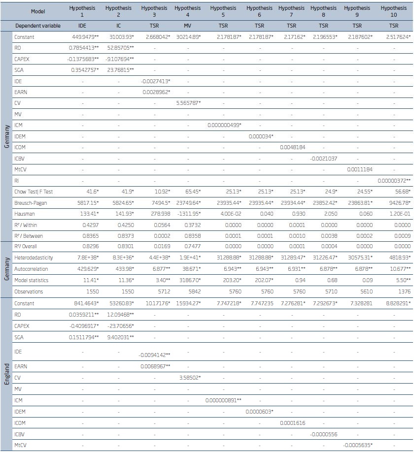 The second hypothesis was to demonstrate that the higher is the investment in research and development (R&D), the capital expenditures in tangible assets (CAPEX) and in general and administrative expenses (SGA), the higher is the intangible capital (IC) in Germany, England, and Portugal with a level of significance of 1%. The independent variables explained the IDE by 75.16%, in relation to the financial measures for the measurement of investments in intangible assets: 93.06% and 73.28%, showing evidence that the variables of hypothesis 2 can be consistent measures for the measurement of intangible assets.