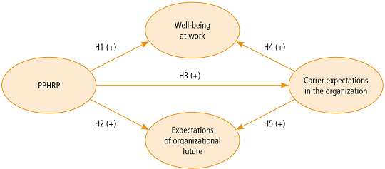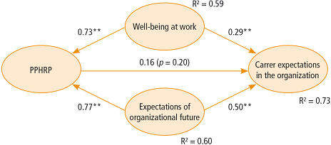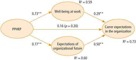 PPHRP = Positive perceptions of human resources policies and practices. The control variable position type (managerial/non-managerial) was omitted to favor the model visualization. **p<o.oI.