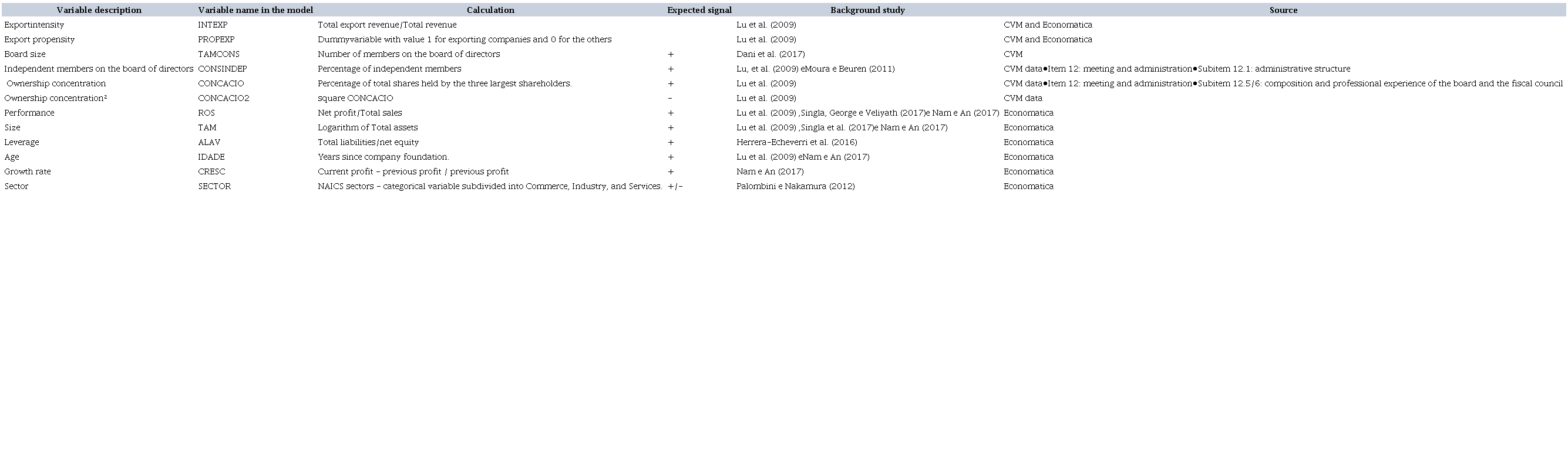 In the Brazilian context, we noticed a lack of studies approaching the relationship of export versus corporate governance mechanisms, which indicates the innovative character of the present study. Most Brazilian studies have addressed the relationship between internationalization and corporate governance (Duarte et al., 2019; Maia et al., 2013), as well as the impacts of the quality of corporate governance on internationalization (Grossi, Vilela, & Pereira, 2017; Moizinho et al., 2014; Sheng & Pereira, 2014). With a sample of 245 companies listed from 2005 to 2010, Moizinho et al. (2014) found that best practices in CG reflect positively on exports, corroborating Sheng and Pereira (2014).