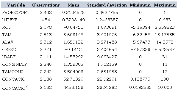 Initially, we performed the descriptive statistics of the variables considering the sample of companies listed on B3. Export intensity ranged from 0 to 93%. Concerning performance, the average ROS of companies was -4.75%, with a maximum value of 255.92%, which may reflect the economic and political crises in Brazil between 2010 and 2017. We observed a profit reduction within the period, and the sample investigated (-0.1412). The average age of companies was 14 years.