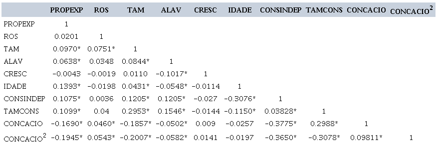 Figure 4.2 shows the correlation between our study variables. We observed a positive and significant correlation between board independence (CONSINDEP) and export intensity (INTEXP), suggesting that greater board independence may favor exports. Besides, board size (TAMCONS) also showed a positive and significant correlation with export intensity.