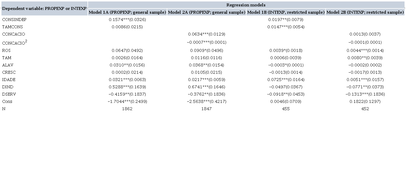 We used models 1A and 1B to analyze the influence of the board of directors on companies’ export decisions. Models 1A and 1B are different for three reasons: 1. dependent variable; 2. regression method; and 3. sample definition. Model 1A has export propensity as the dependent variable, adopts the logit model, and considers a sample of 307 companies listed on B3 (Brazil Stock Exchange and Over-the-Counter Market) in the analyzed period. Model 1B has export intensity as the dependent variable, adopts the tobit model, and considers a sample of 61 exporting companies in the analyzed period.