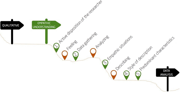 The figure, which is based on a qualitative approach, presents our methodological approach of empathic understanding. According to the path presented, before starting the field experience, the researcher must be willing to activate his/her sensory and perceptual faculties before the beginning of the data production and, in doing so, initiating the analysis and defining the situations of empathy. With the knowledge collected in the field, the researcher must then do the descriptions using his/her “open text” so that, in the imaginary dimension, the reader can be transported to the field that provides the information that is being narrated. Once this is done, the dominant characteristic of the information gathered is defined, and the data are, thus, ready to follow their path.