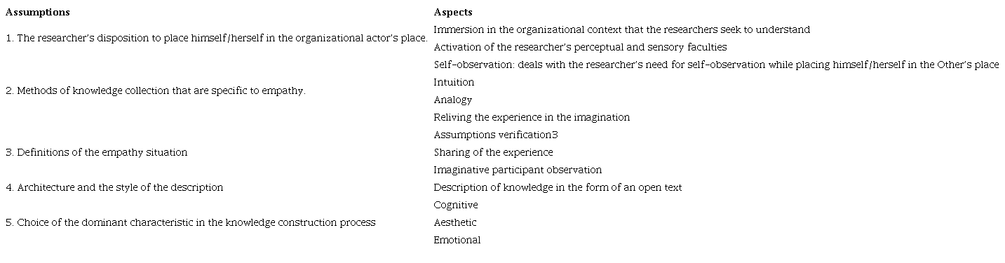 It should be noted that Strati (2007a) has outlined a set of proposi-tions in relation to the operationalization of such an approach. Such propositions include the following: 1. the researcher should be willing to put himself/herself in the organizational actor’s place by putting his/her empathy into practice; 2. empathic understanding requires a specific method for data collection; 3. empathic situations should be defined; 4. the architecture and the style themselves should also be defined for the description of empathy by means of an “open text”; and 5. the predominant characteristic should be identified in the knowledge production process.