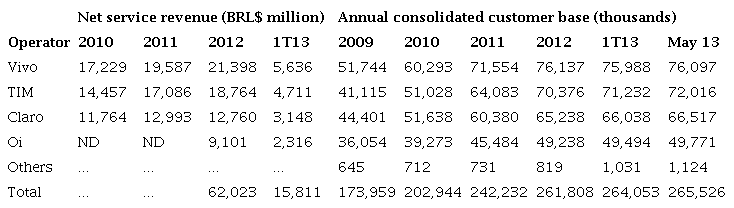 Cellular telephony in Brazil started to be implemented in 1991 in regional state operators linked to a company called Telecomunicações Brasileiras (Telebras). The operation consisted of a business line parallel to the other services offered at the time, under the name of Cellular Mobile Service (SMC), transformed, in 2001, into a new cellular mobile communications service, the Personal Mobile Service (SMP). SMP operators accounted for 99.5% of the market, totaling approximately 265 million customers in May 2013, with revenues of BRL$ 16 billion in the first quarter of that year.