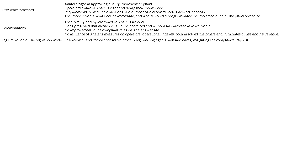 The verified interaction process had a strong influence on the speeches by both Anatel and the operators. This interaction was used to build the enforcement represented by the meetings and requirements of investment plans and improvements by the agency. It was also used to build the compliance through the observation of the operators regarding the requirements of the regulator, with simultaneous disclosure to the audience in search for resonance, aiming at the elimination of the compliance trap, by consolidating the legitimacy of Anatel’s regulatory model in a connection between action and discourse, with the production of texts aimed at understanding the way (Phillips et al., 2004).