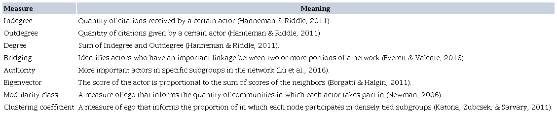 For the analysis of the measures in the SNA, the participants’ answers about the relationships with their peers were organized in adjacency matrices that enabled the analysis of centrality data and grouping for each actor in the network. The measures of degree, indegree and outdegree centrality, authority, eigenvector, modularity class, and clustering coefficient were generated using the Gephi software (Bastian, Heymann, & Jacomy, 2009) for each type of mapped network. Figure 2.3.1 shows the meaning of each measure.