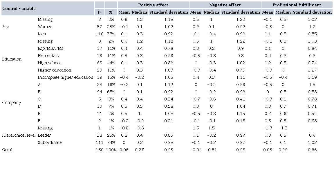 This section begins by presenting the descriptive data of the well-being scores distributed in the three following factors: positive affect, negative affect, and professional fulfillment. This distribution, in turn, is shown by the demographic variables, namely: gender, education, company of origin, assumption of leadership or subordinate position, and overall calculation (Figure 3.1).