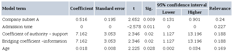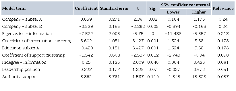 The authority metric in the supportive network (B = 7.16; t(5) = 2.35; p < 0.020), central in the subgroup of origin, can predict an increase in positive affect. The bridging coefficient in the information network (B =−0.23; t(5) =−2.26; p < 0.025) indicates a decrease in the positive effect factor scores. Employees with the highest rates of bridging coefficient are those who function as bridges, that is, they are crucial connectors in social networks.