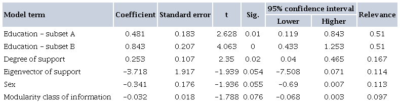 For this first model, linear regression enabled us to identify the relevant metric related to the ties established when searching for information and support (Figure 3.1.1).