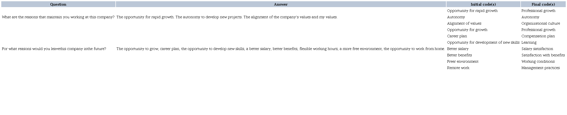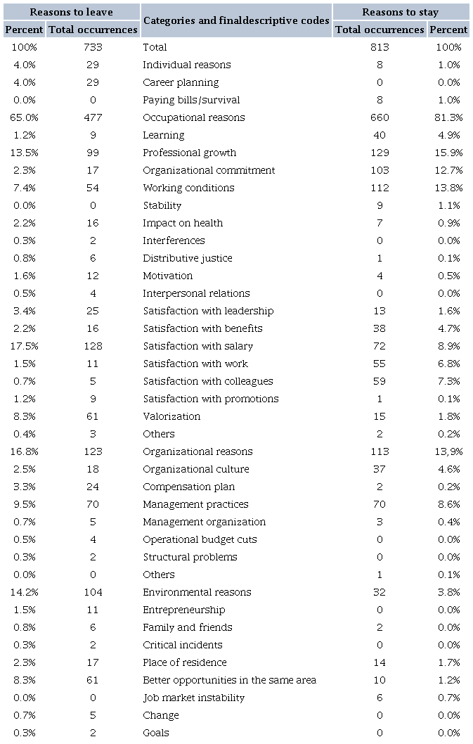 The data were coded independently by the researchers and later discussed. The analysis of the 440 answers from the professionals to the question “What are the reasons that maintain you working at this company?” generated 475 codes, with 733 occurrences. The analysis of the answers from the professionals to the question “For what reasons would you leave this company in the future?” generated 407 codes, with 813 occurrences. A single answer can generate multiple codes, as coding by sentence or by line was used (Saldaña, 2009).