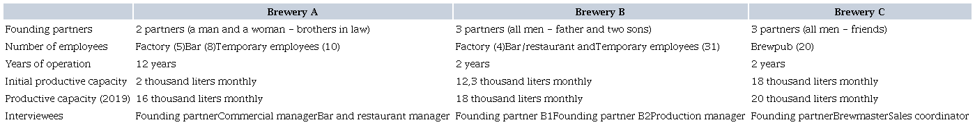 The data were collected between September and November 2019, using the interview technique (Fontana & Frey, 2011; McKenzie, 2007). This activity included personal meetings between the team of researchers and the agents interviewed in the space of the studied breweries – factory, administrative offices, pubs, restaurants, or bars. Nine interviews were carried out in total, three in each company, all of them with written authorization from the interviewees. The number of interviews was defined based on the number of central agents involved in each of the studied breweries. The criterion of data saturation was also considered, observing when it was found that new personal meetings for data collection would not add relevant evidence to the investigation reported (Fontanella, Ricas, & Turato, 2008). Figure 3.1 presents the categorization of the companies studied and the agents interviewed in detail.