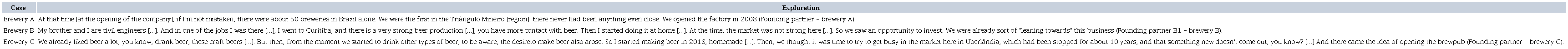 In specific terms, the interviewees’ narratives, properly contextualized within the scope of each studied craft brewery, reveal the configuration of ambidexterity practices based on a balance between exploration and exploitation initiatives (Chen, 2017; Gupta et al., 2006; Koriak et al., 2018; Luger et al., 2018; Moss et al., 2014). Among these practices, it is possible to highlight aspects such as the foundation of the studied breweries, actions aimed at consolidating these companies in the market, the definitions and redefinitions of their business models, the creation of new types and styles of beer, improvements in terms of increase in production capacity, product quality, consumer satisfaction, market share, customer loyalty, and the adoption of new technologies, among other situations.