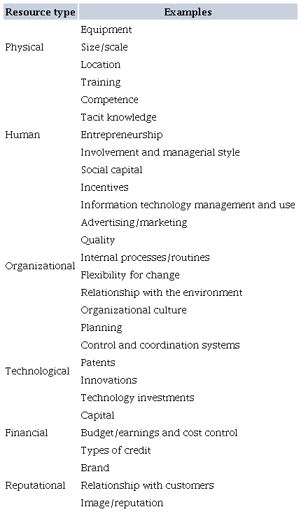 Classical strategy authors have proposed different classifications for resources (Penrose, 1959; Wernerfelt, 1984; Barney, 1991) and agree upon the importance of heterogeneity in generating returns for the firm through competitive advantage. Penrose’s (1959) classification was the basis for subsequent categorizations. For the author, resources are assets available to the firm for use according to a management decision and comprise two types: physical and human.