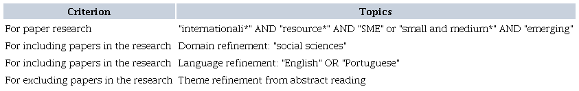 We used the keywords “internationali*” AND “resource*” AND “SME” or “small and medium*” AND “emerging” in order to find results for resources, internationalization, SMEs, and emerging countries. We chose documents published until August 17, 2016, in English and Portuguese, resulting in 32 articles. Figure 3.1 presents the research criteria adopted in the systematic literature review.