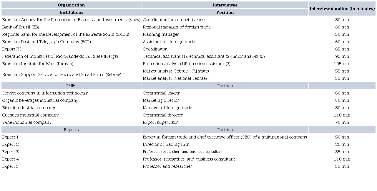 In the second stage, we carried out 18 interviews, with five experts in foreign markets, five SMEs, and eight institutions, with an average duration of 74 minutes each (Figure 3.2). The interviews took place in the first half of 2017. For the selection of interviewees, we used the snowball technique. Among the institutions, there are those that work at the national and regional levels, financing and logistics institutions, which have specific programs to encourage and support internationalization. Experts and institutions suggested the SMEs in order to get information from these companies’ experience. We finished this step when we reached a degree of saturation or repetition of the resources mentioned in the interviews.