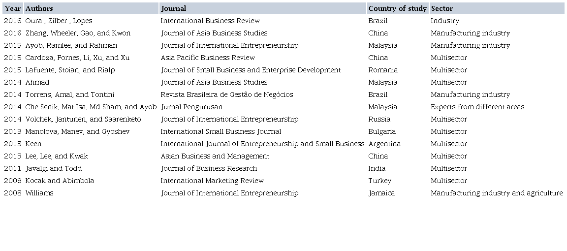 The results show 15 papers (Figure 4.1) involving 40 different authors, with only one of them participating in two articles. The remaining 13 articles did not have any repeated authors. The articles were published between 2008 and 2016, most frequently in 2013 (three), 2014 (four), and 2015 (three). In 2016, we found two papers published until the end of data collection. There are 12 different journals, one of which published two articles from the sample (Journal of Asia Business Studies), and the other published three articles from the sample (Journal of International Entrepreneurship), which shows the relatively high representation of these two journals on this topic if we consider the whole sample. Although publications have increased significantly until 2017, at the time of the research, it was still a little explored subject.
