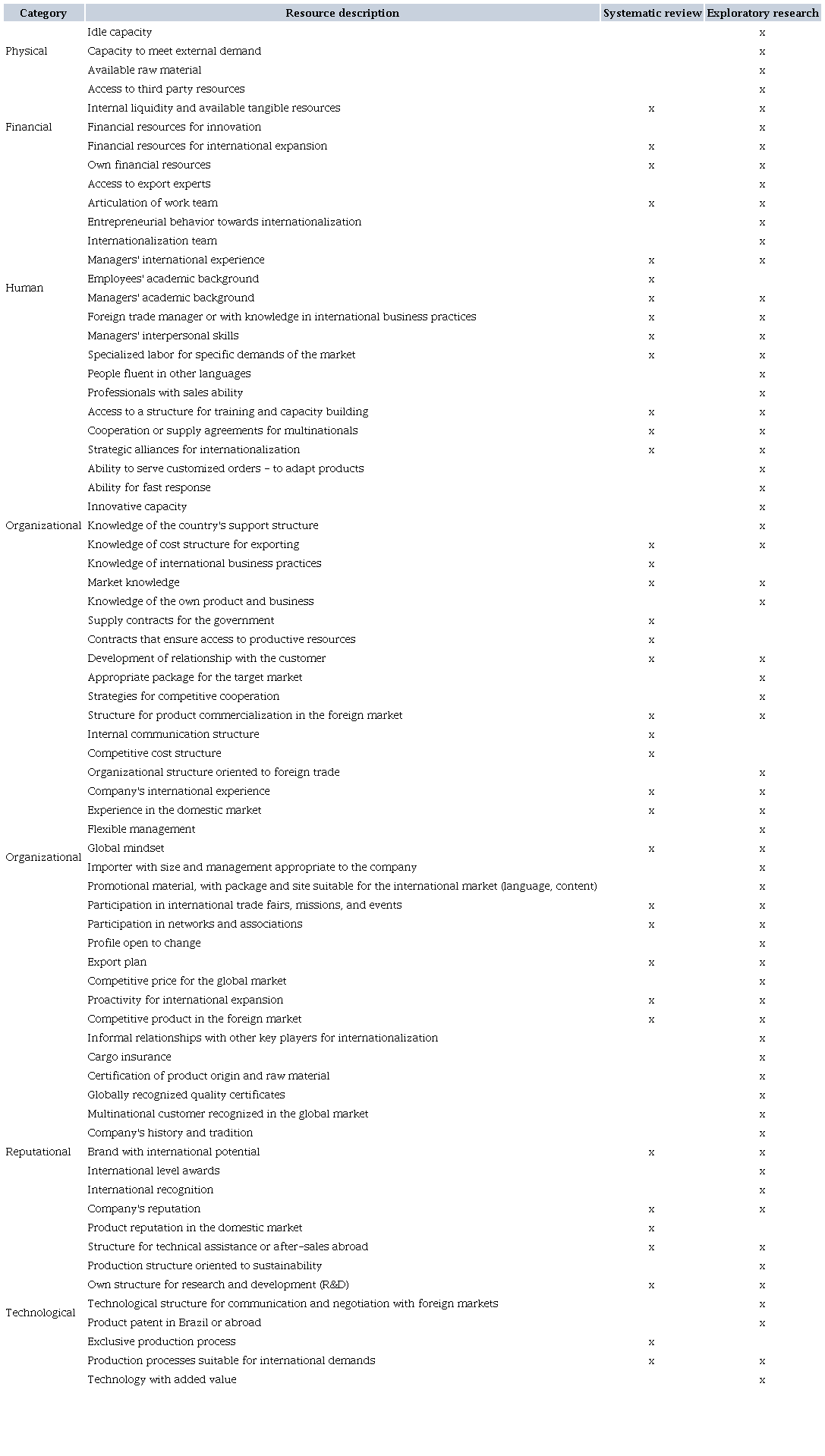 Regarding technological resources, most of those identified in SLR were present in the exploratory research, like “structure for technical assistance or after-sales abroad”, “R&D own structure”, and “production processes suitable for international demands”. Yet, the “exclusive production process” resource does not appear in the exploratory research, perhaps because in Brazil it is a scarcer resource, considering companies’ low technological intensity (Carvalho & Avellar, 2013). On the other hand, only the exploratory research identified resources such as “production structure oriented to sustainability”, “technological structure for communication and negotiation with foreign markets”, “product’s patent in Brazil or abroad”, and “technology with added value”. This is also consistent with SMEs’ low technological intensity.