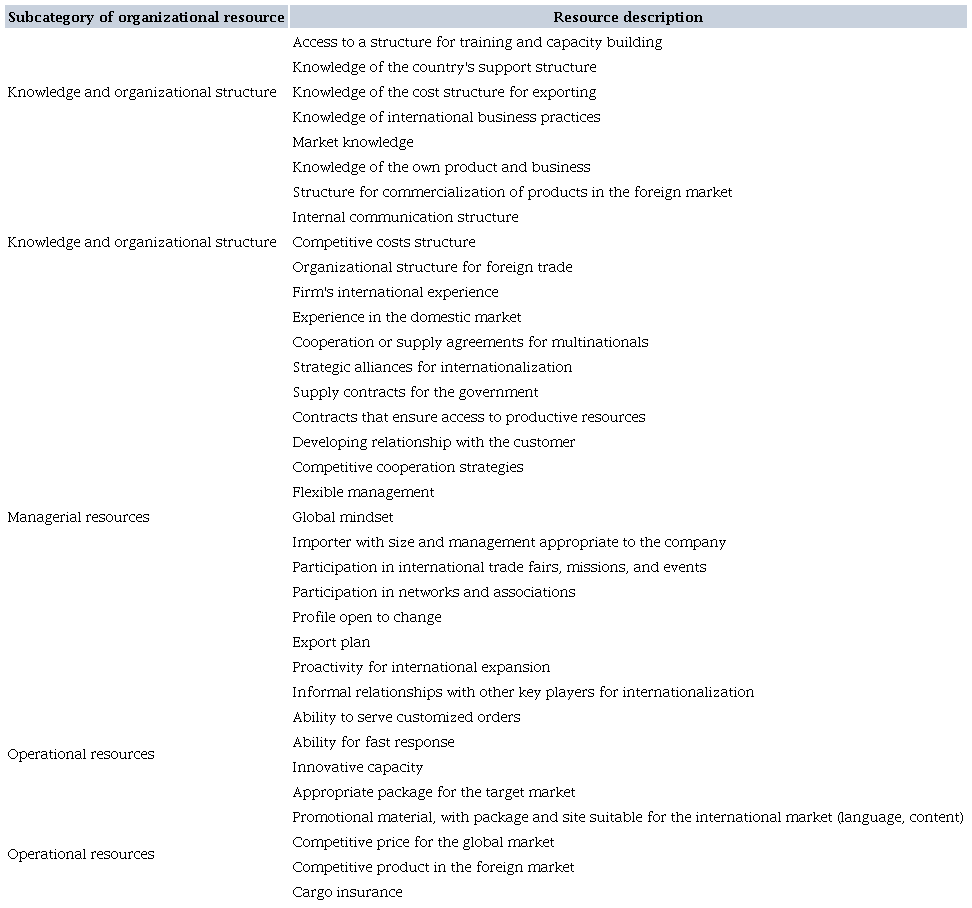 Studies based on RBV and addressing the Brazilian context have identified the relationship between some resources and SMEs’ internationalization. Torrens et al. (2014) analyzed the determinants of export performance, by considering two types of resources as variables for analysis: organizational resources, such as the beginning of exports, firm experience, visits to foreign markets, and relationship with governments and technological hubs’ networks, and management resources, like sales and profitability as incentives, perception of barriers to Brazilian products, and manager’s knowledge on international legislation and activities. The authors highlight two constructs of organizational and management resources, showing that resources and international experience affect the export performance of SMEs. In this case, the classification adopted disregards firm resources, such as physical.