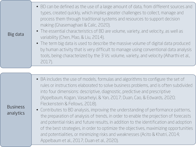Business strategies are increasingly data-dependent, and BDA is redefining innovation, competition, and productivity (Côrte-Real et al., 2019). BDA supports the set of technologies, methods, and advanced applications for data storage, management, and analysis to improve decision-making (Chen et al., 2012). However, BD and BA are distinct elements. Figure 2.1.1, below, presents these definitions.