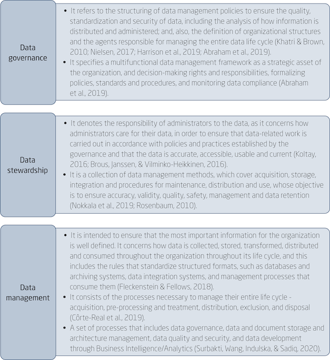 Despite the importance of the theme and the existence of several conceptual studies, empirical research on governance and data management is scarce and fragmented, as pointed out in the literature review conducted by Abraham, Schneider, and vom Brocke (2019). Moreover, the existing empirical research on Data Stewardship (DS) addresses the issue in an exploratory way through qualitative research - see Nokkala, Salmela, and Toivonen (2019) and Plomp, Dintzner, Teperek, and Dunning (2019). Terms such as data governance, data management, and data stewardship are sometimes used interchangeably, although they are separate elements. Data governance refers to organizational policies and rules for solving problems or providing services to data stakeholders (Harrison et al., 2019; Lillie & Eybers, 2018). Data management deals with organizational processes related to the data life cycle - acquisition, pre-processing and treatment, distribution, exclusion, and disposal (Côrte-Real et al., 2019; Fleckenstein & Fellows, 2018). These policies, rules, and processes are implemented by the data stewards responsible for the exercise of DS, which is the link between data policy and the implementation of actions by users (Alhassan, Sammon, & Daly, 2018; Plomp et al., 2019).