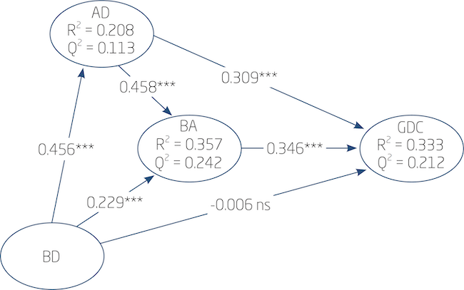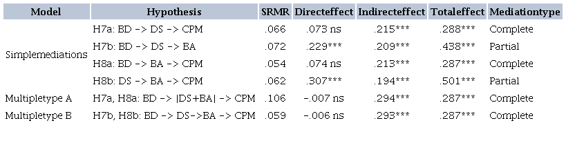 Regarding the analysis of multiple mediation, it is observed that the effect of BD in CPM is completely transmitted through explanatory variables, both when the mediators occur with causality in parallel - multiple mediation model “type A” - and when they occur in a serial way - multi- ple mediation model “type B”. However, when they occur in a serial way, where mediator DS precedes mediator BA, although no differences in the total effect are observed, important differences are observed in the model adjustment. First, the multiple mediation model “type B” presents higher coefficients of determination (R²) and predictive relevance (Q²) of the endogenous variable BA. Second, a considerable difference was observed in the model’s adjustment indicator since the SRMR of the estimated model “type B” is lower (0.059) than that of “type A” (0.106). Therefore, it is verified that, in fact, the multiple mediation effect of these variables behaves in a serialized way (type B) because, for a good level of adjustment, the SRMR indicator must be less than 0.08 (Hair et al., 2017; Hu & Bentler, 1999).