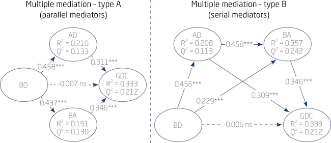 In addition to simple mediations, according to Zhang, Zyphur, and Preacher (2009), two different types of multiple mediation of mediating variables were analyzed: “type A”, a multiple mediation that considers mediators with causality in parallel, and “type B”, a multiple mediation that considers the serialized causality relationship between the mediating variables, starting from the premise that DS is antecedent to BA, as hypothesized in the research model. This procedure aims to assess which model of multiple mediations is the one with the most significant explanatory power. Figure 4.3.2 shows the results of the analyzed multiple mediation models.
