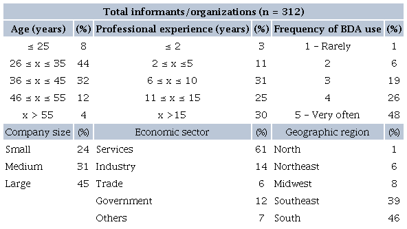 The desired population was managers of Brazilian organizations from various economic sectors who work with BD. Data were collected through a survey instrument, through an electronic form, answered by 366 people. For the qualification of the sample, two questions for screening the participants were established. Thus, 312 qualified observations were collected from experienced professionals and managers who confirmed the use of BDA in the organization in which they worked. More than 70% of the sample has a graduate degree. Approximately 75% of the participants are trained in business management, IT, and statistics, which is compatible with data science users. Most participants (61%) work in organizations in the service sector, especially in the areas of IT (18%), business management, marketing and market intelligence (18%), and financial/banking services (11%). Each informant who answered the survey corresponds to an organization, so the sample represents 173 Brazilian organizations. There is a concentration of organizations from the South and Southeast regions (86 percent of the total), which are the most economically active regions in the country. Figure 3.2.1 shows the profile of respondents and organizations.