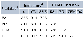 Discriminant validity indicates how much one construct differs from the others. The most modern criterion is Henseler’s Heterotrait-Monotrait Ratio (HTMT), by Henseler, Ringle, and Sarstedt (2015), which according to Mikalef et al. (2020) is better than Fornell-Larcker’s, through which the average correlation of indicators between constructs measuring different aspects of the model is compared in relation to the average of correlations of indicators within the same construct, whose results should reach the limit of 0.85 (Henseler et al., 2015; Hair et al., 2019). Therefore, it is observed that there is convergent validity.