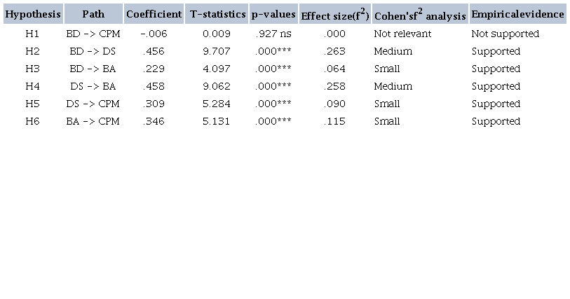 As for the analysis of simple mediations, the results show that both DS and BA completely mediate the relationship between BD and CPM (supported H7 and H8). Complete mediations mean that DS and BA constructs can fully convey the effects from BD to CPM. In addition, DS partially measures the relationship between BD and BA, and BA partially measures the relationship between DS and CPM. This means that DS can transmit a portion of the BD effect to BA and that BA transmits part of the effect from DS to CPM.