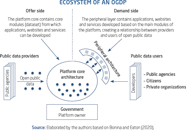 The architectural focus of an OGDP is a central framework that allows the coupling of modules as a dataset for government and third-party developers, who create services for a society based on these open public datasets (Bonina & Eaton, 2020).