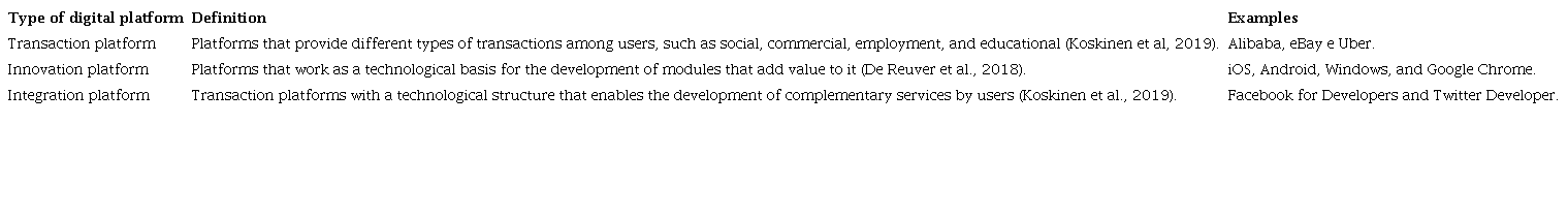 Although the concept of a digital platform is strongly sensitive to the specificities and interests of each area of knowledge, the vast majority of digital platforms share three basic characteristics: technological mediation, interactivity between different groups of users, and the possibility of simultaneous activities by each group of users (Koskinen et al., 2019). Furthermore, it is possible to classify digital platforms into three categories: 1. transaction platforms; 2. innovation platforms; and 3. integration platforms (Koskinen et al., 2019).