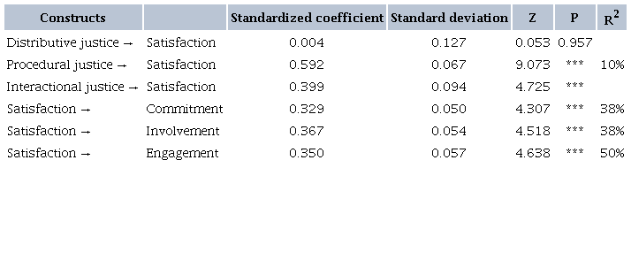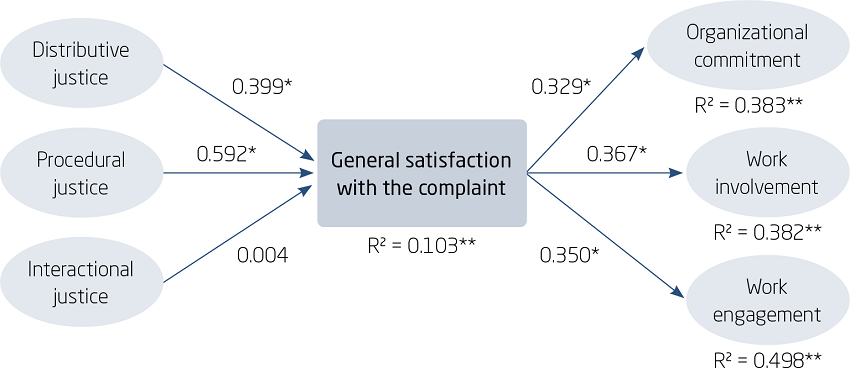 At the end of this step, we started to check the relationships of the constructs, calculating the standardized coefficient (β) and coefficient of determination (R2) (Malhotra et al., 2017). As shown in Table 3, five out of the six hypotheses were confirmed as positive and statistically significant. Therefore, the positive relationship between distributive and procedural justice and satisfaction with complaint management (hypotheses 1 and 2, respectively) is confirmed, as well as satisfaction with complaint management and organizational commitment, involvement and engagement at work (hypotheses 4, 5, and 6, respectively). Only the relationship between interactional justice and satisfaction with the management of the complaint (hypothesis 3) was not significant.