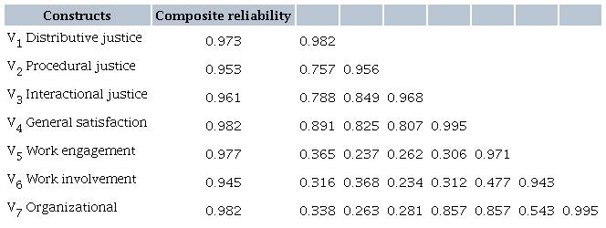 In the factor analysis, all variables of the three dimensions of justice (distributive, procedural and interactional) presented loads much higher than the recommended minimum (> 0.5). A very popular measure of internal consistency is Cronbach’s alpha, which ranges from 0 to 1, with an acceptable minimum limit of 0.6 (Hair et al., 2014). As shown in Table 1, all values found were much higher than the recommended minimum, thus confirming a satisfactory internal consistency (Malhotra et al., 2017).