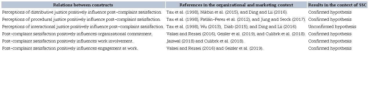 As discussed so far, in the context of SSC, only the perceptions of interactional justice do not have a positive impact on post-complaint satisfaction, contradicting, in part, the theoretical assumptions that served as the basis for this study. This result was different from expectations that perceptions of fair interactions within the organizational environment would influence job satisfaction (Diab, 2015) and the post-complaint satisfaction of online retail customers (Ding & Lii, 2016). Thus, it is expected that this study has contributed to the advancement of research on this important organizational phenomenon called SSC by using a relationship marketing approach to investigate the impact of satisfaction with managing complaints on commitment, involvement and engagement at work, in the context of SSC.