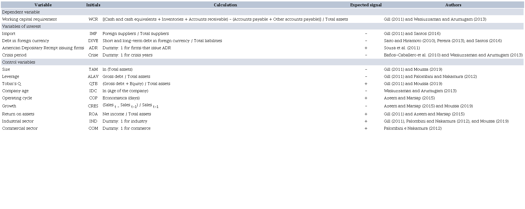 The dependent variable of the research is the WCR, which is calculated by the sum of short-term resources (cash and equivalents, inventories, and accounts receivable) subtracted from the sum of short-term obligations (accounts payable and other accounts payable), and the resulting amount is divided by the total assets so that the variable is standardized according to the size of the firm ( Gill, 2011; Wasiuzzaman & Arumugam, 2013).