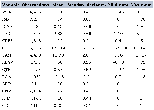 Table 2 presents the descriptive statistics of the variables used in the model after the treatment of outliers. According to this table, it is observed that the variable WCR, which is the dependent of the study, presents 4,465 observations. Regarding the variables of interest, it is possible to notice that there was an increase in firms that issue ADR, since the average of this variable is higher when compared to the average found by Santos et al. (2015).