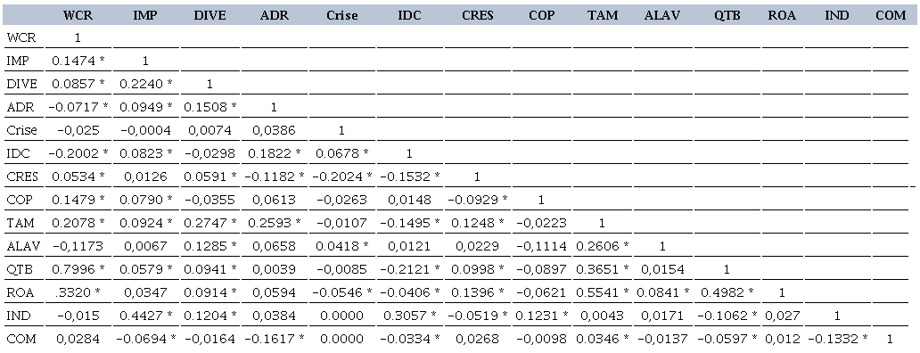 The variable DIVE also showed a positive correlation with the WCR. However, although the issuance of ADR has presented a weaker correlation with it than the other proxies for internationalization, it presented a negative correlation with the dependent variable. The crisis variable, which is also of interest to this study, did not show a statistically significant correlation with the WCR, although it was expected that firms would reduce their WCR, due to the tendency to reduce economic activities.