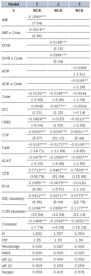 Based on the use of the GMM, three econometric models were used, so that, in all of them, the WCR is the dependent variable. Thus, we decided to include the IMP, DIVE and ADR variables individually in each of these models, since these three variables were used as proxies for the internationalization of firms. And, also, in the three models, the dummy variable for crisis was included, as well as its interaction with each internationalization proxy. The econometric models used are presented below, in which i represents the firm; t, the year; β 0, the intercept; and ε, the error.