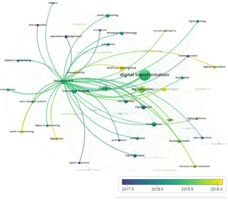 The definition of search terms went through two stages. The first stage aimed to evaluate and validate the relationship and relevance between the terms IA, IoT, and OM. To this end, a preliminary search was performed only in the WoS database using the term “digital transformation”, resulting in 3,084 articles. To analyze these articles, VOSviewer bibliometric software 1.6.16 was used (Van Eck & Waltman, 2010, 2011). The identification of the theories areas was based on the keywords’ co-occurrence, filtered for at least five repetitions. To improve the visualization, terms outside the scope of the search were deleted from the retrieved data, such as: “health”, “government”, “Covid-19” etc.); and, also, methods or terms out of scope, for example: “methods”, “case study”, “survey”, “culture” etc.). As a result, the terms “industry4.0”, “internet of things”, “big data”, “digitalization”, and “artificial intelligence” showed to be the most evident and close to “digital transformation” (Figure 1). The relationship between OM and AI/IoT can be observed in Figure 2, which shows OM as a more consolidated research area – before 2017 –, but which has been evolving and forming an important grouping around “industry 4.0”, which, in turn, has been supported by technologies that use IoT, attracting newer areas, such as “artificial intelligence”, “digital technologies”, “smart manufacturing”, “digital innovation”, and “digital twin”.